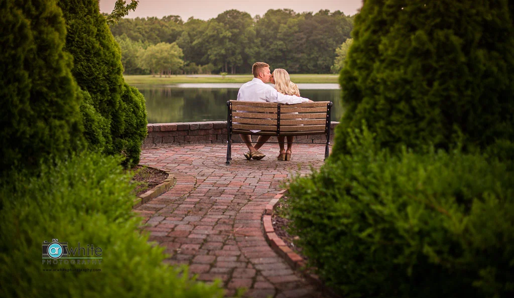 The hedges frame the couple on the bench perfectly during their engagement session at Smokey Hollow in Selbyville, De.